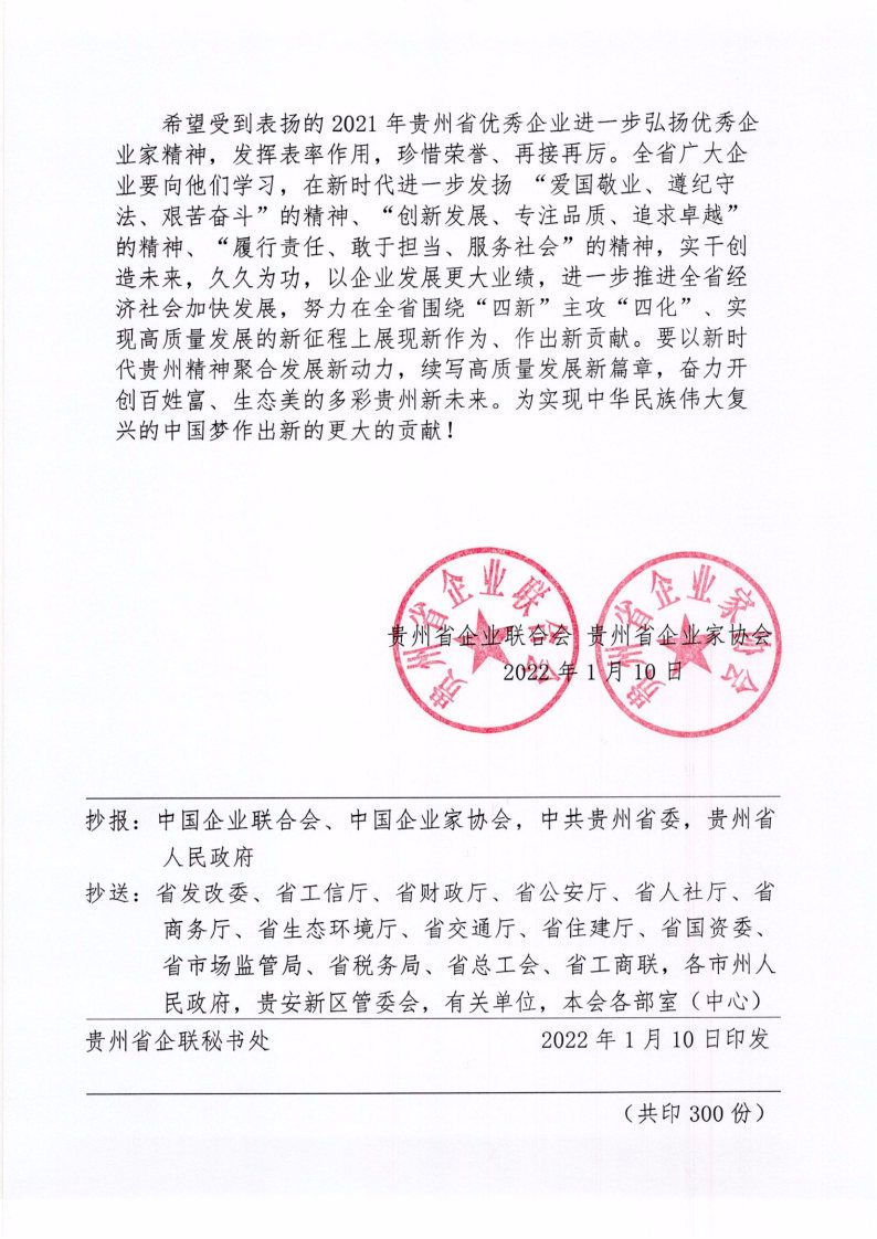 2022年1月10日,貴州省企業(yè)聯(lián)合會、貴州省企業(yè)家協(xié)會印發(fā)《關(guān)于通報(bào)表揚(yáng)2021年貴州省優(yōu)秀企業(yè)的決定》,集團(tuán)公司被授予“貴州省優(yōu)秀企業(yè)”榮譽(yù)稱號。