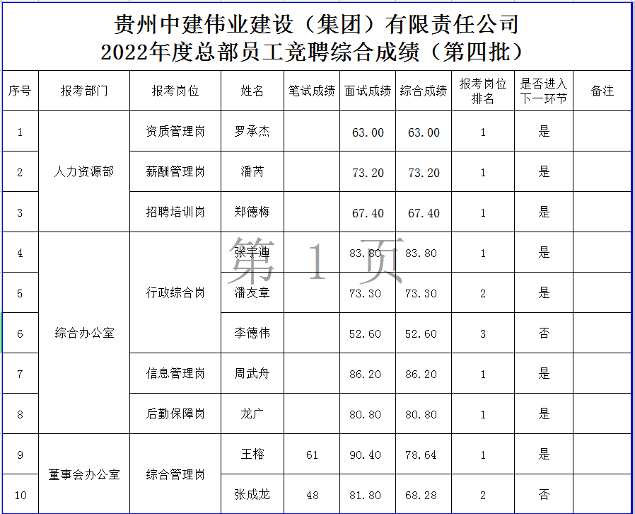 貴州中建偉業(yè)建設(shè)(集團(tuán))有限責(zé)任公司2022年總部員工競(jìng)聘綜合成績(jī)公示(第四批)